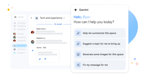 With Gemini in Chat, you have a partner who’s always ready to provide answers, summarise conversations, find files in Drive and brainstorm new creative ideas.