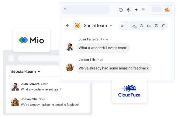 Migrate your existing data from Slack or Teams using Chat APIs or Workspace partners like CloudFuze and CloudM, or enable cross-product collaboration with interoperability solutions from Mio.