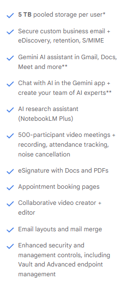 Business Starter, Business Standard and Business Plus plans can be purchased for a maximum of 300 users. There is no minimum or maximum user limit for Enterprise plans. Google Workspace customers may have access to additional features for a limited promotional period.