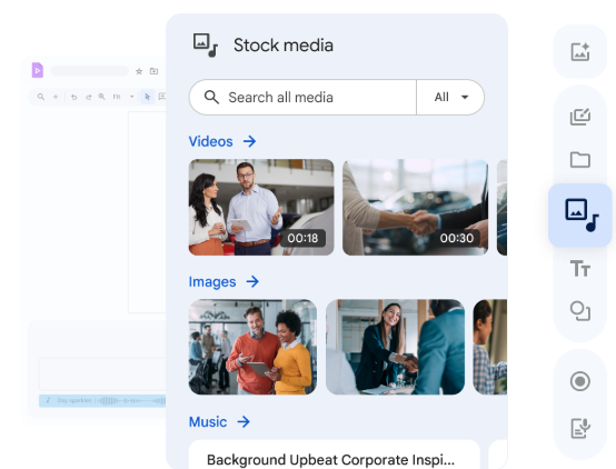 Enhance scenes with high-quality, royalty-free stock media, music and more from our content library, or generate an image using Gemini in Vids.